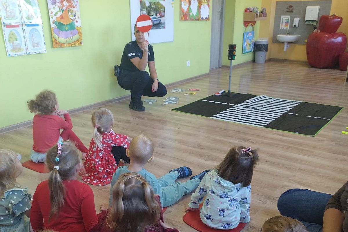 • policjantka tłumaczy jak wygląda znak "zakazu ruchu"