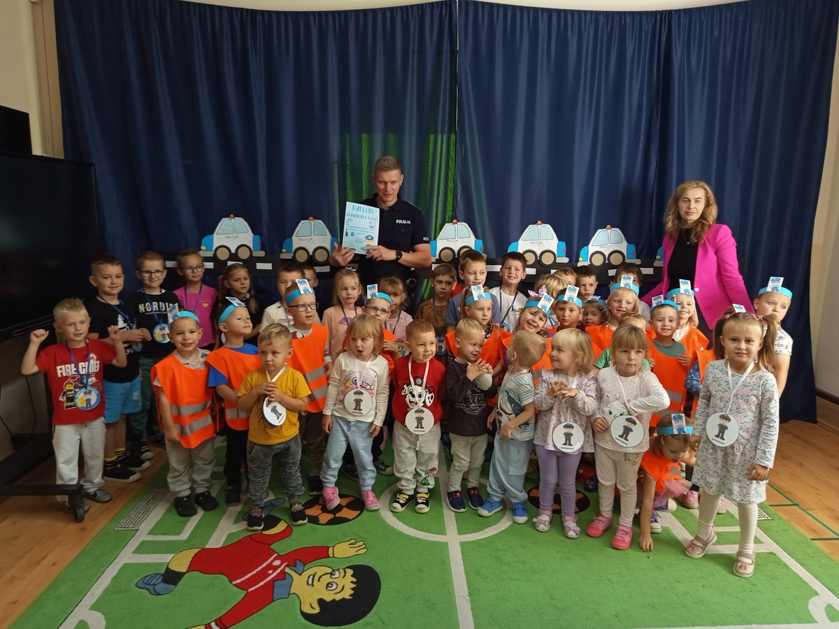 Druga część spotkania dotyczyła bezpiecznych zachowań w różnych sytuacjach, ale przede wszystkim w ruchu drogowym. Choć dzieci mogą przebywać same na drodze dopiero po ukończeniu 7 roku życia, to już w klasach przedszkolnych uczymy podstawowych prawidłowych zachowań na drodze, aby maluchy wiedziały, że obowiązują tam ważne zasady.