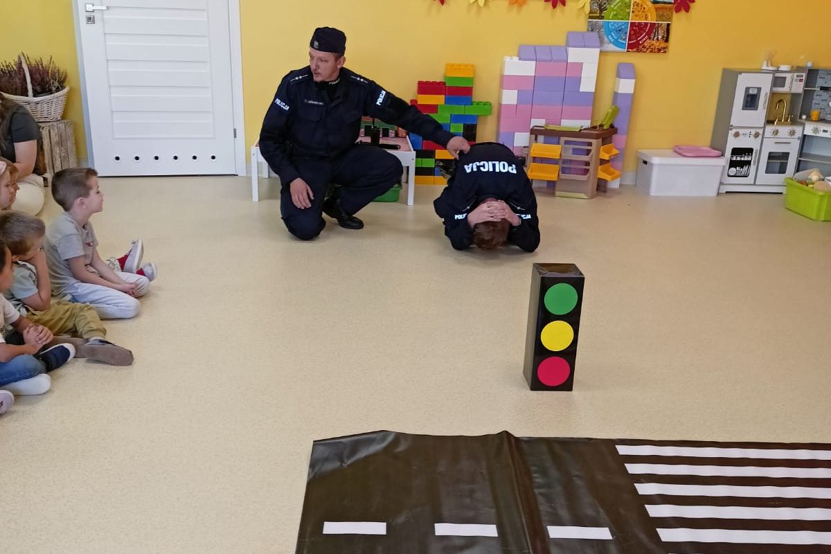 Akademia przedszkolaka uczy i wychowuje. Tym razem lekcja bezpieczeństwa została zrealizowana z udziałem mundurowych. Funkcjonariusze opowiadali o bezpiecznym przechodzeniu przez jezdnię i znakach drogowych. Wyjaśnili, dlaczego tak ważne jest noszenie odblasków i jak one działają.