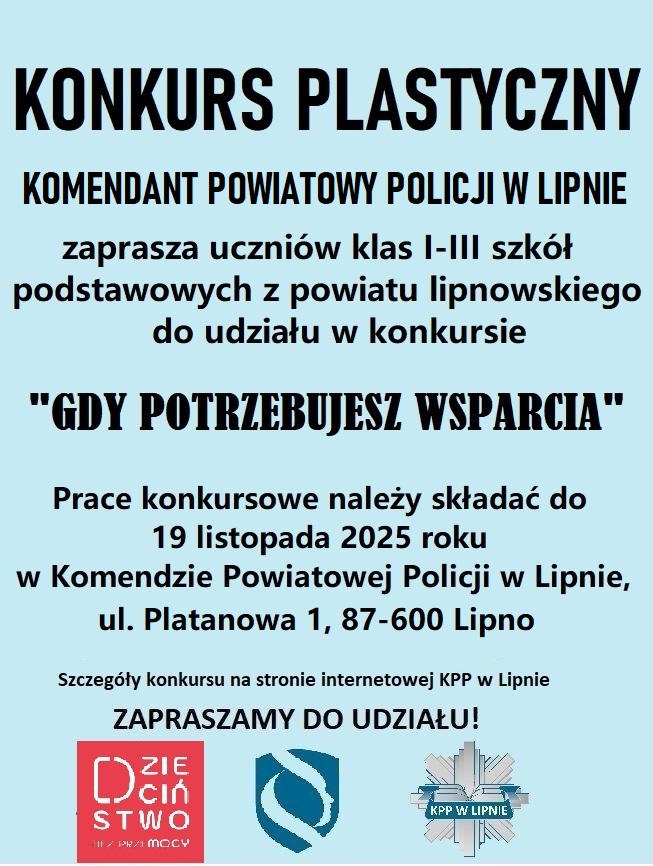 Pracę należy dostarczyć do Komendy Powiatowej Policji w Lipnie na ul. Platanową 1 (87-600 Lipno), w terminie do 14 listopada 2025 roku. Rozstrzygnięcie konkursu nastąpi do 19 listopada 2025 roku.