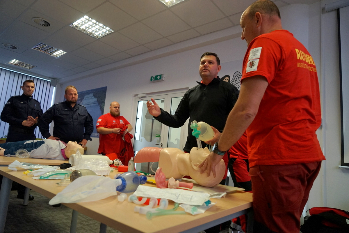 Następnie Wiceprezes Zarządu Głównego WOPR Pan Maciej Banachowski przypomniał w jaki sposób efektywnie udrażniać drogi oddechowe przy udzielaniu kwalifikowanej pierwszej, a także poprowadził warsztaty praktyczne w tym zakresie.