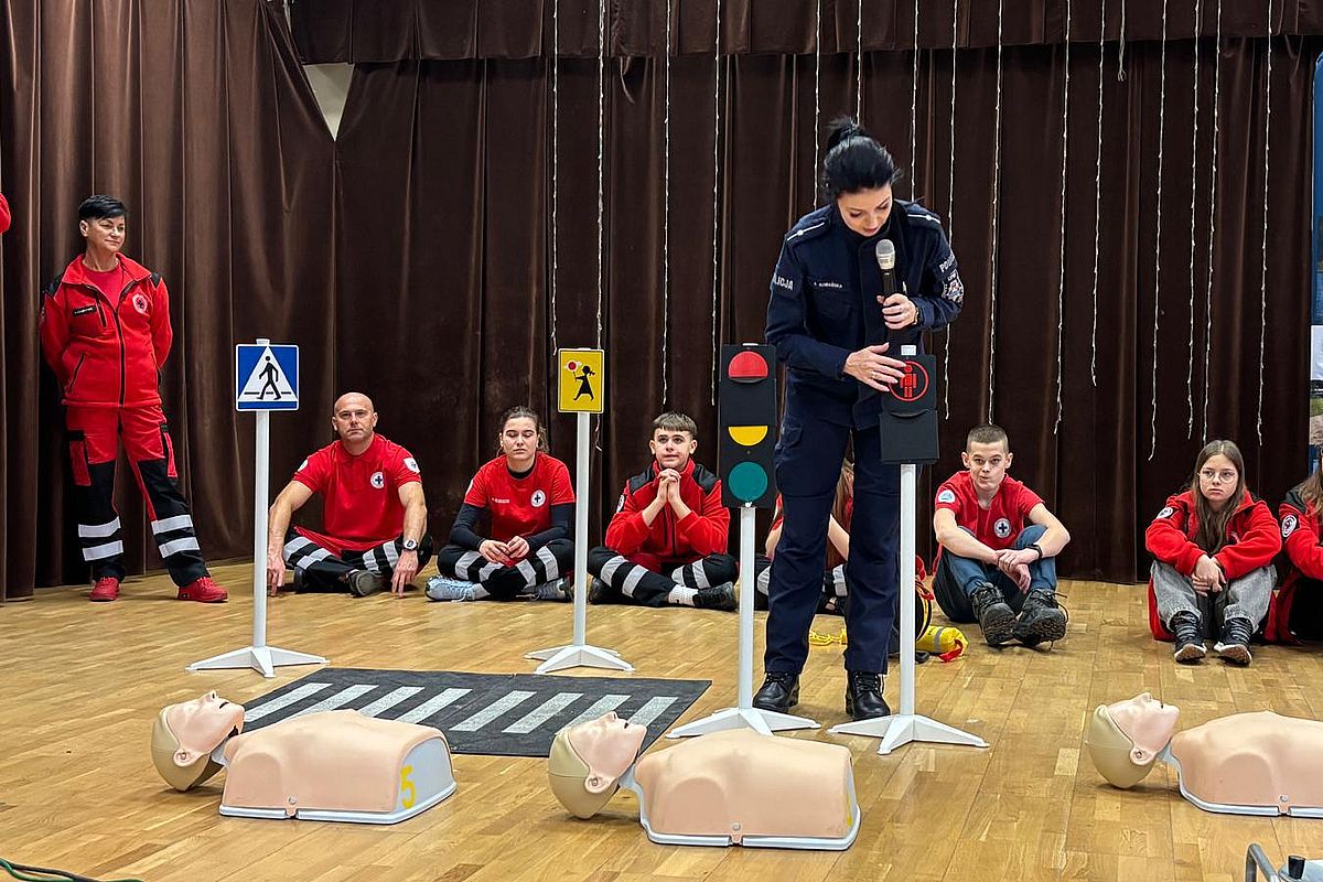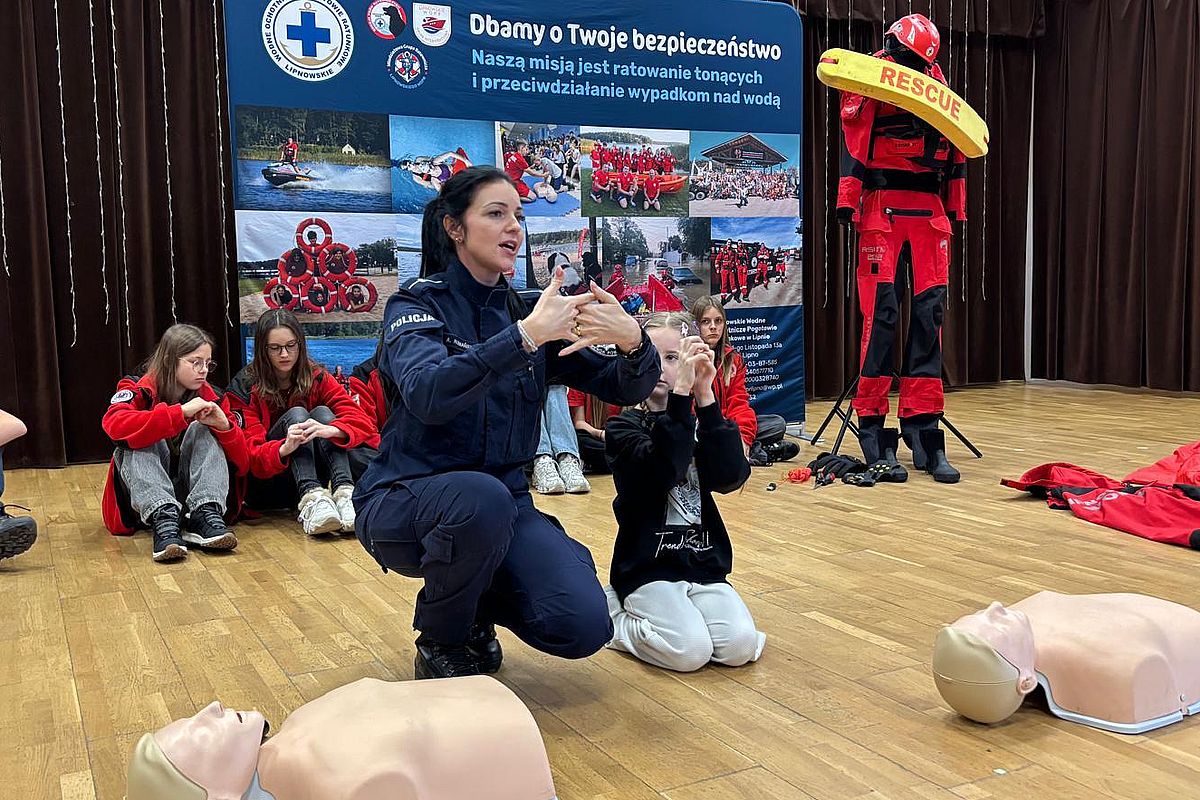 Mundurowi przypominają także podstawowe zasady resuscytacji i prowadzą zajęcia praktyczne na przywiezionych ze sobą fantomach.