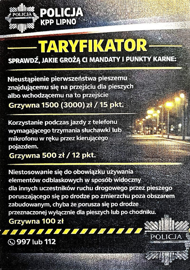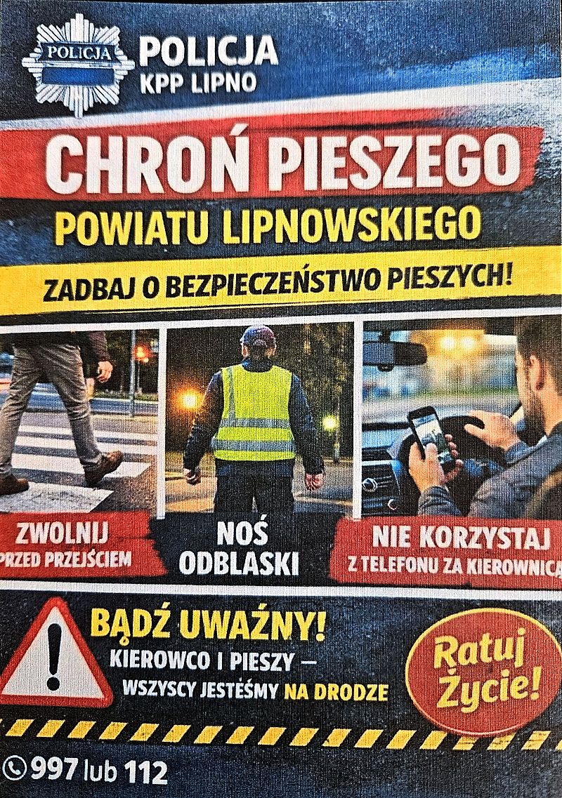 Policjanci Wydziału Ruchu Drogowego z miejscowej komendy powiatowej opracowali plan działań na rzecz poprawy bezpieczeństwa w ruchu drogowym pod nazwą „Chroń pieszego powiatu lipnowskiego”. Zakładane w planie działania i akcje potrwają do 26 czerwca bieżącego roku.