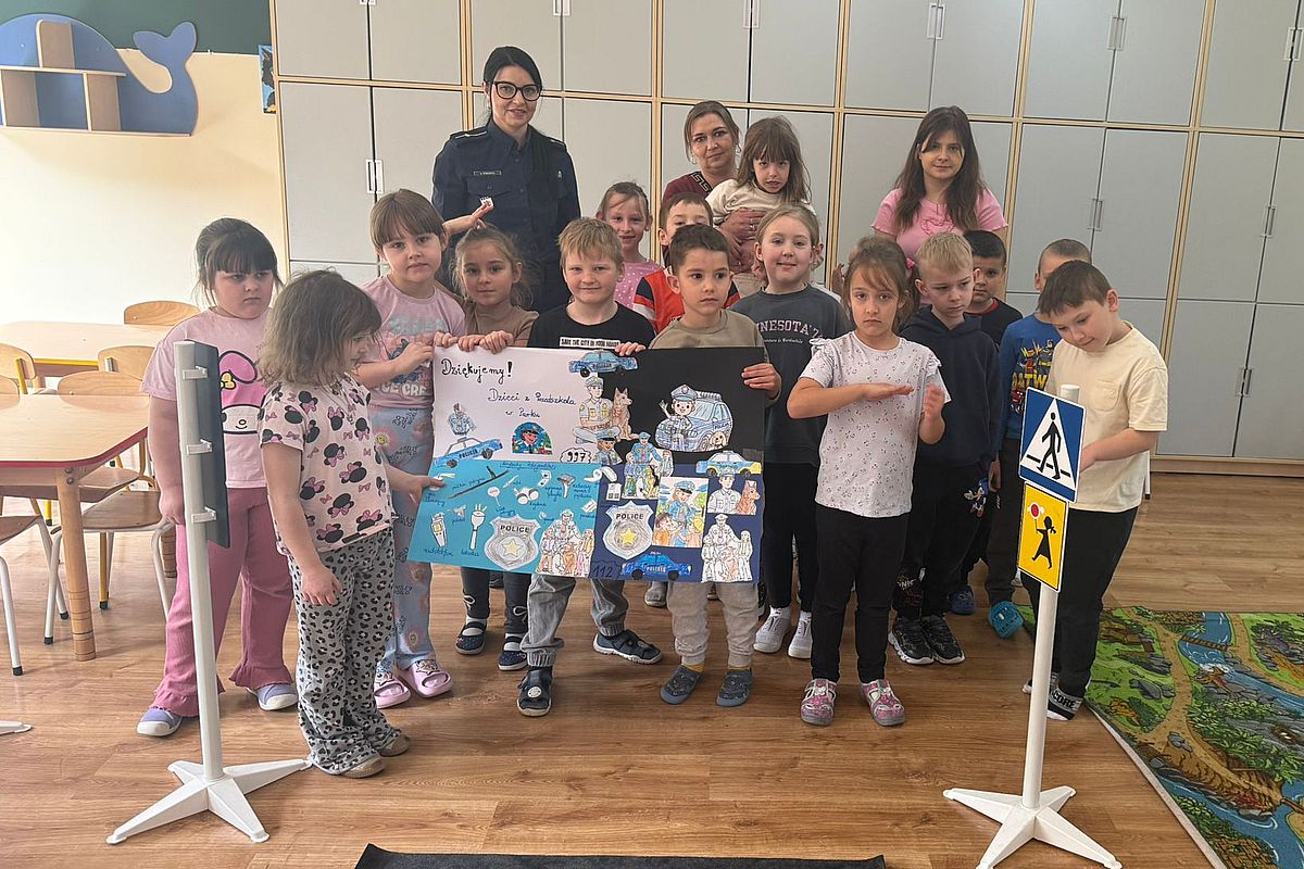Zabawa w miasteczku ruchu drogowego i mierzenie policyjnych czapek dostarczyły dużo radości. Dzieci odwdzięczyły się mundurowej pięknym plakatem z policyjnymi elementami.